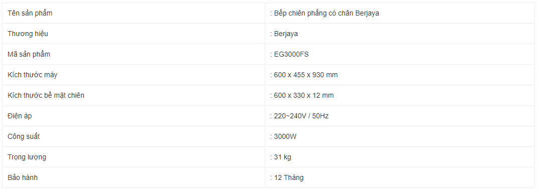 Bếp chiên phẳng có chân Berjaya EG3000FS với thiết kế cao cấp, hiện đại. Bếp mang trong mình nhiều tính năng nổi bật, với giá thành cạnh tranh. Bếp chiên phẳng Berjaya này đang được các đầu bếp hàng đầu Việt Nam và thế giới sử dụng. Sau đây mời các bạn cùng khám phá tinh năng của bếp chiên rán phẳng Berjaya này.