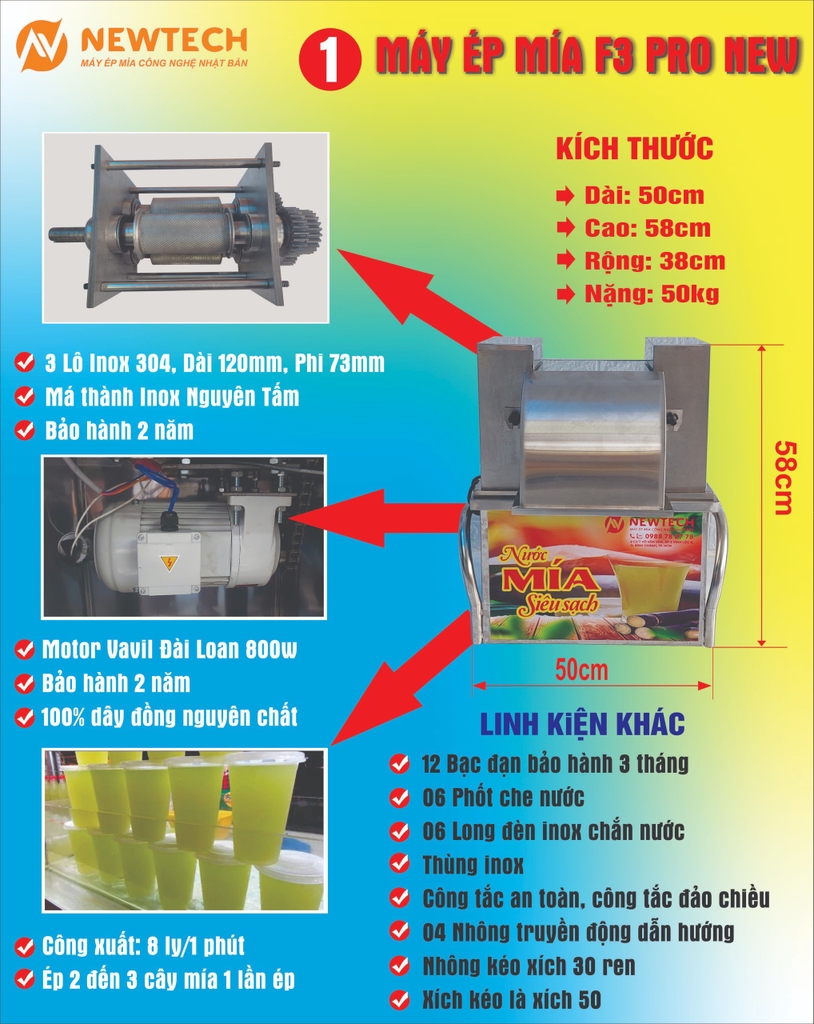 Linh kiện khác: 12 đạn bạc bảo hành 3 tháng, 6 phốt che nước, 6 long đèn inox chắn nước, thùng inox, công tắc an toàn, công tắc đảo chiều, 4 nhông truyền động dẫn hướng, nhông kéo xích 30 ren, xích kéo là xích 50