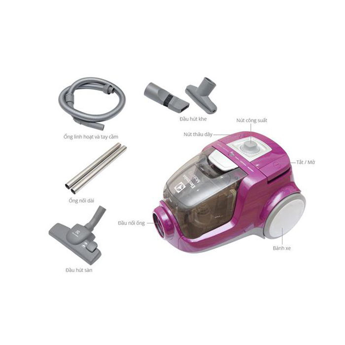 Máy hút bụi Electrolux ZLUX1811 nhỏ gọn, với gam màu tím trẻ trung, thiết kế bắt mắt, thêm vào đó là bánh xe bằng cao su không gây trầy xước sàn nhà, đảm bảo cho bạn di chuyển dễ dàng.
