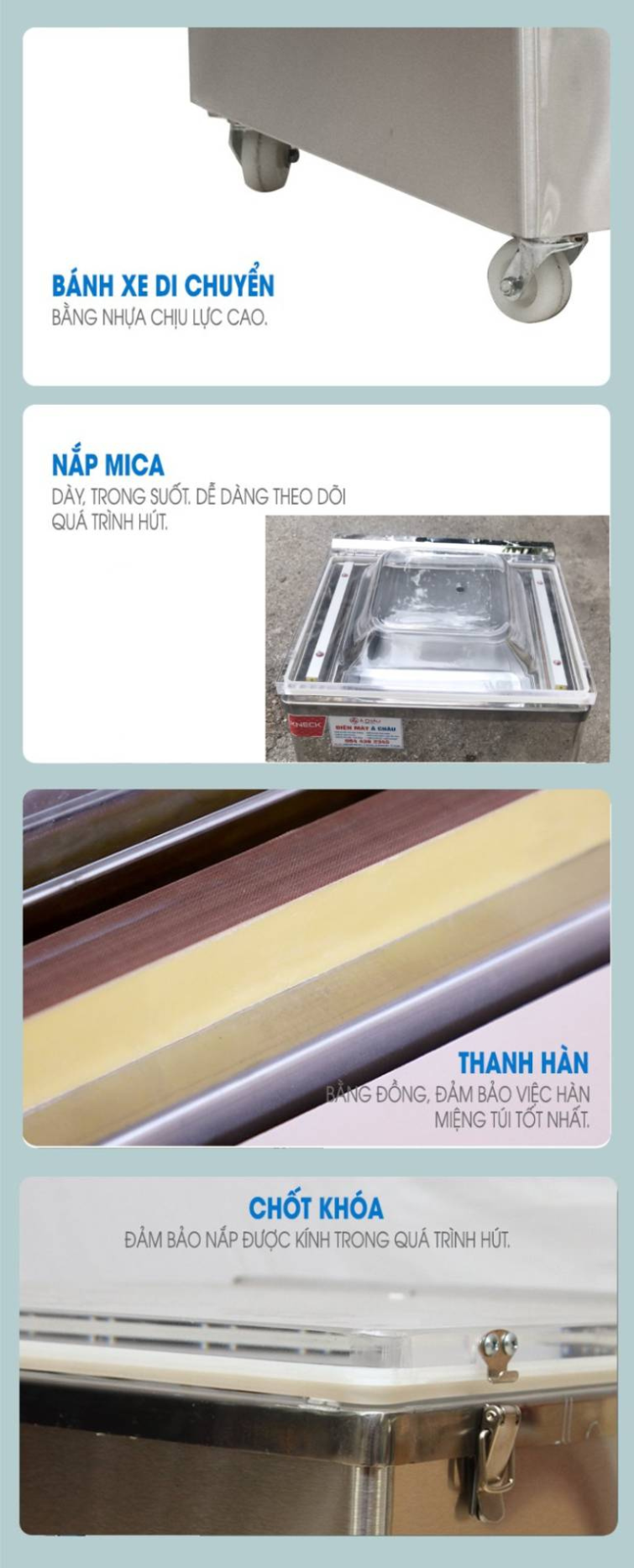 Máy hút chân không DZQ-380 có buồng hút và nắp đậy mica được dập nguyên khối, dày dặn, đảm bảo độ kín tuyệt đối giúp máy chịu lực nén tốt trong quá trình hoạt động. Bên cạnh đó, với chất liệu Mika trong suốt, bạn cũng có thể quan sát toàn bộ quá trình hút chân không một cách dễ dàng, từ đó có sự điều chỉnh kịp thời hoặc dừng khẩn cấp nếu xảy ra sự cố.