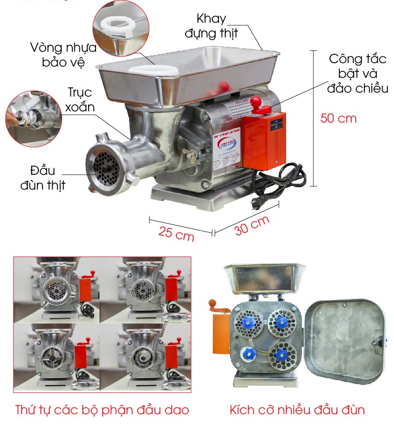 Máy xay thịt được trang bị công tắc hai chiều. Khi cho thịt vào vặn công tắc chiều phải. Nếu thịt bị kẹt trong máy thì vặn trái công tắc để đùn thịt ngược trở lạ