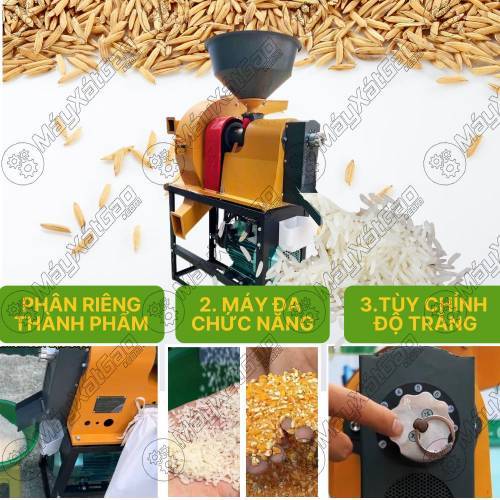 Máy có khả năng xát sạch vỏ trấu, cho hạt gạo đồng đều, tỷ lệ gạo vỡ thấp. Đầu nghiền búa giúp nghiền các loại ngũ cốc và nguyên liệu khác, đáp ứng nhu cầu chế biến đa dạng.