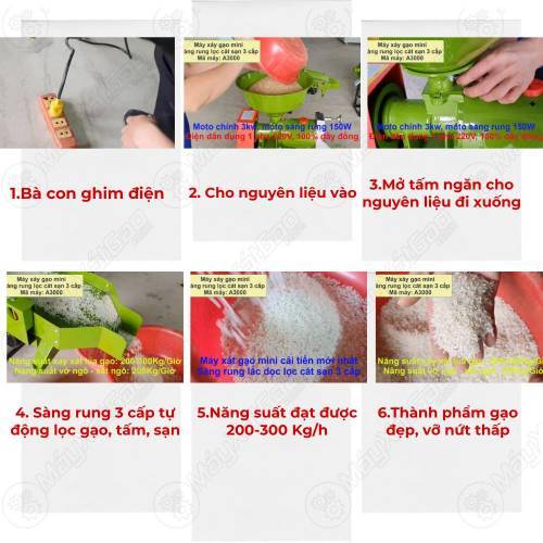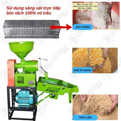 Máy xay xát lúa gạo mini UN‑A3000 là thiết bị chuyên dụng kết hợp xát gạo và lọc cát sạn qua hệ thống sàng rung 3 cấp. Sản phẩm phù hợp cho hộ gia đình, cơ sở sản xuất nhỏ và trang trại, giúp nâng cao hiệu quả xay xát và đảm bảo chất lượng gạo sau khi xay.